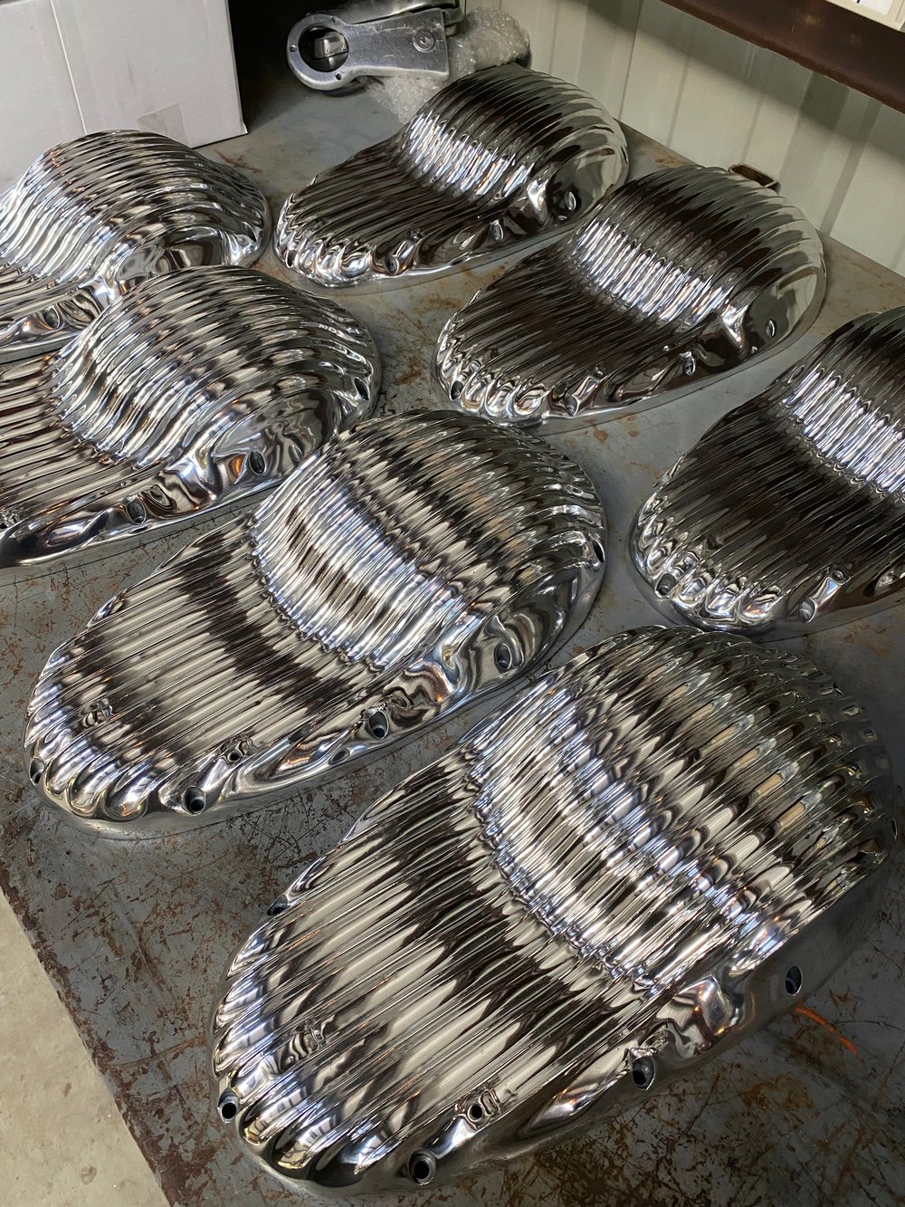 A reproduction of 70s style finned primary covers. Hand made and sand cast in Santa Cruz CA.